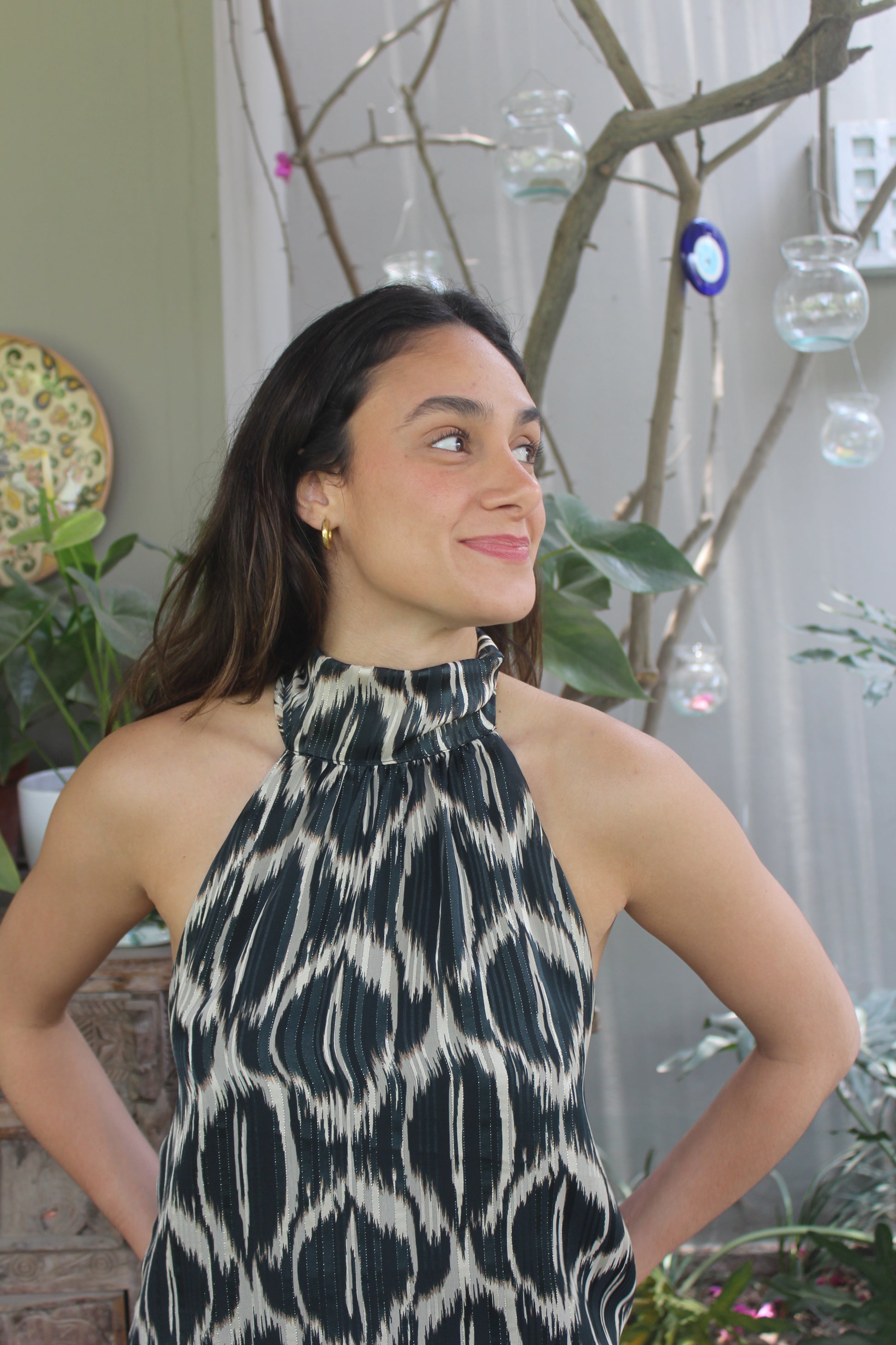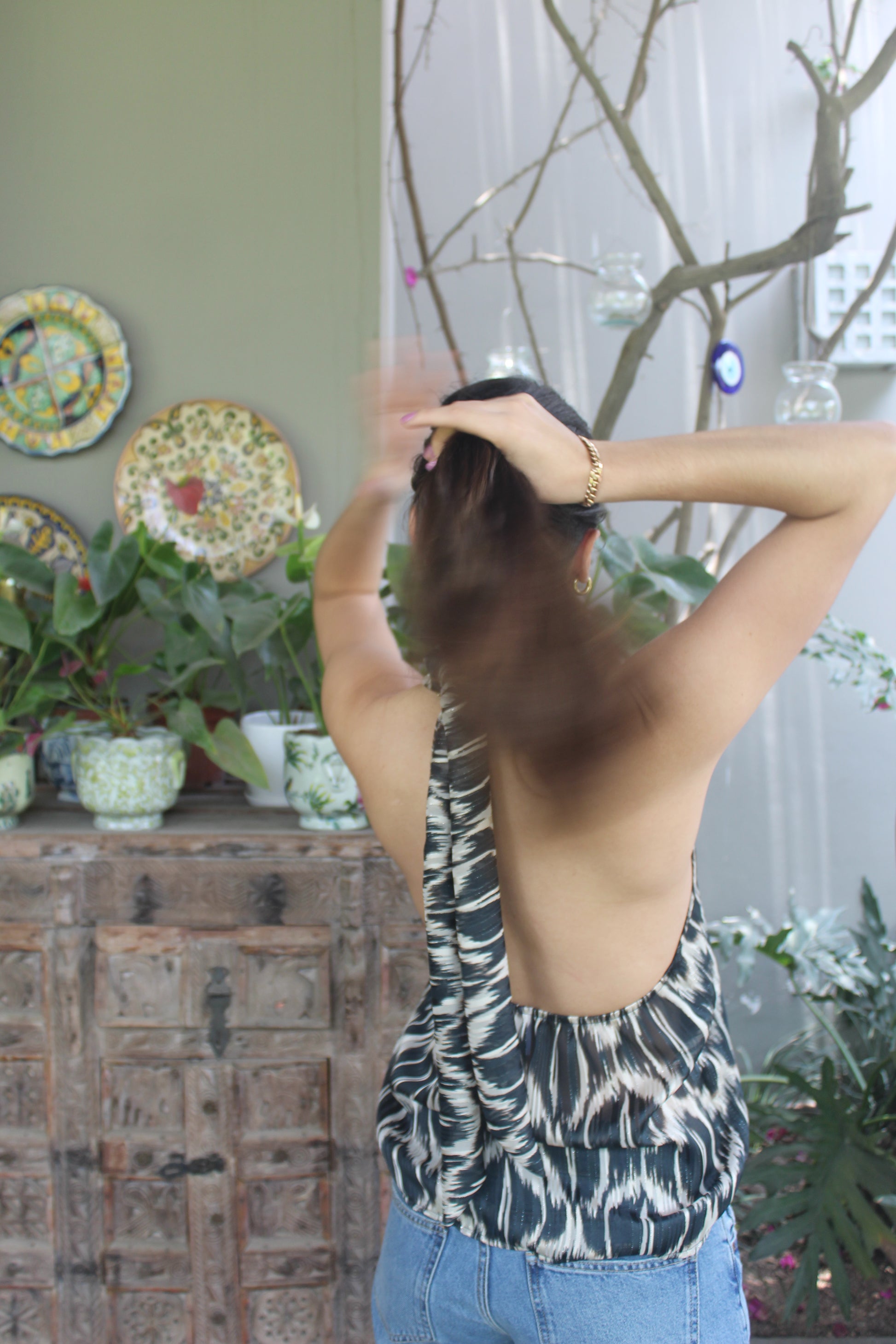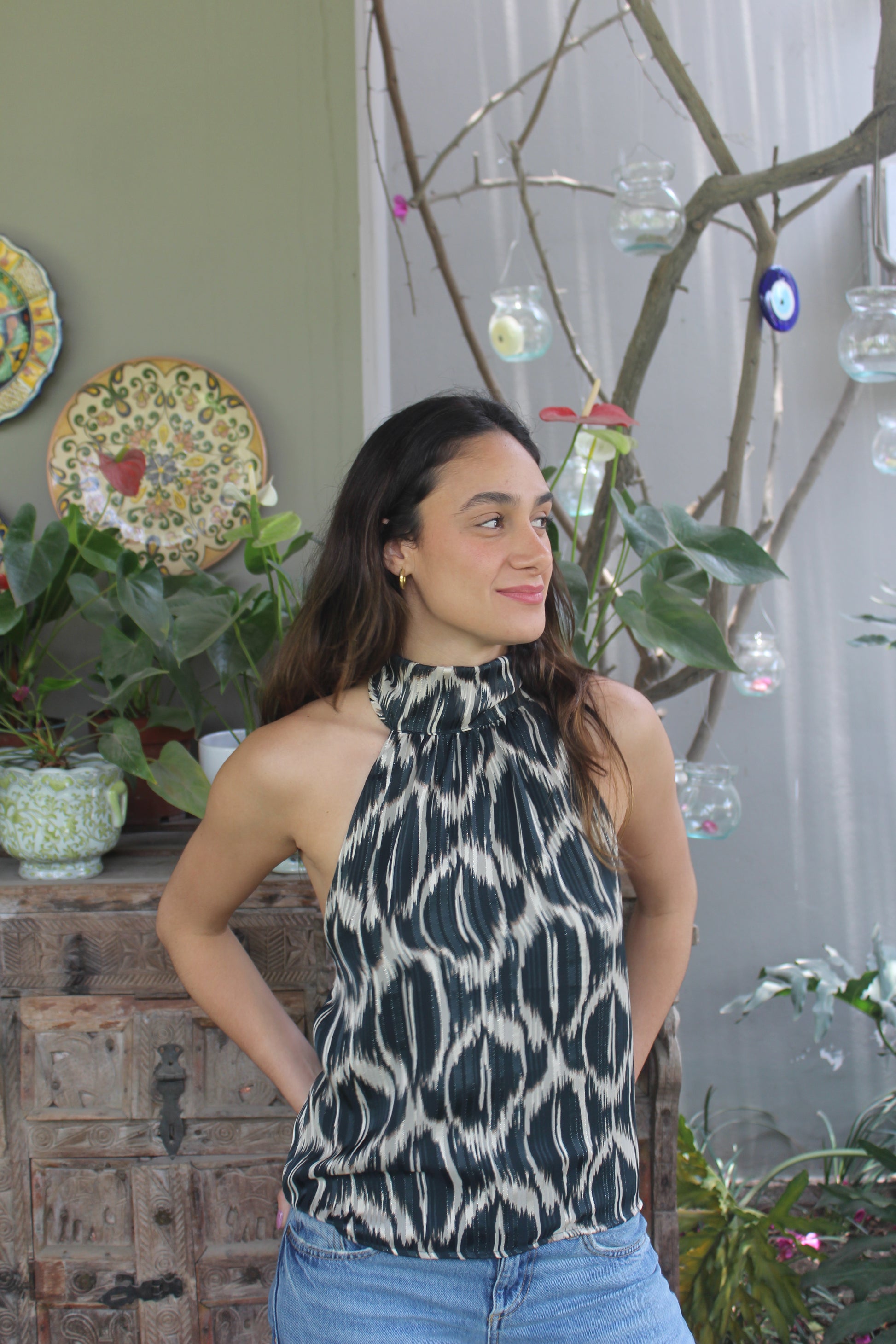 Top halter con espalda semi descubierta para amarrar en el cuello y con elástico en la espalda.